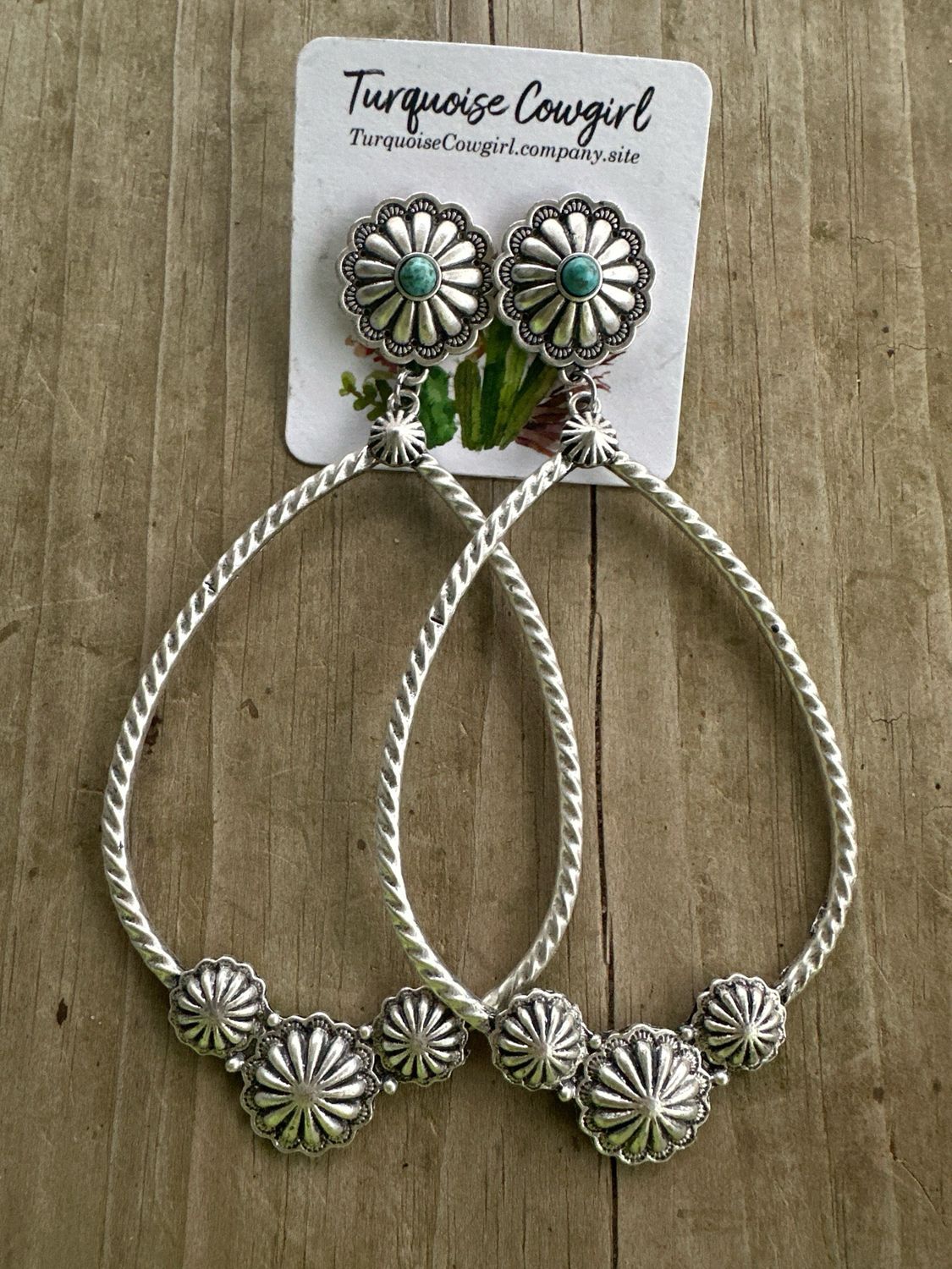 Really cute rope and concho details with a dot of turquoise! The matte silver finish is one of my favorites! Nearly a 5” dangle, so these mean business! WESTERN! UNIQUE!!